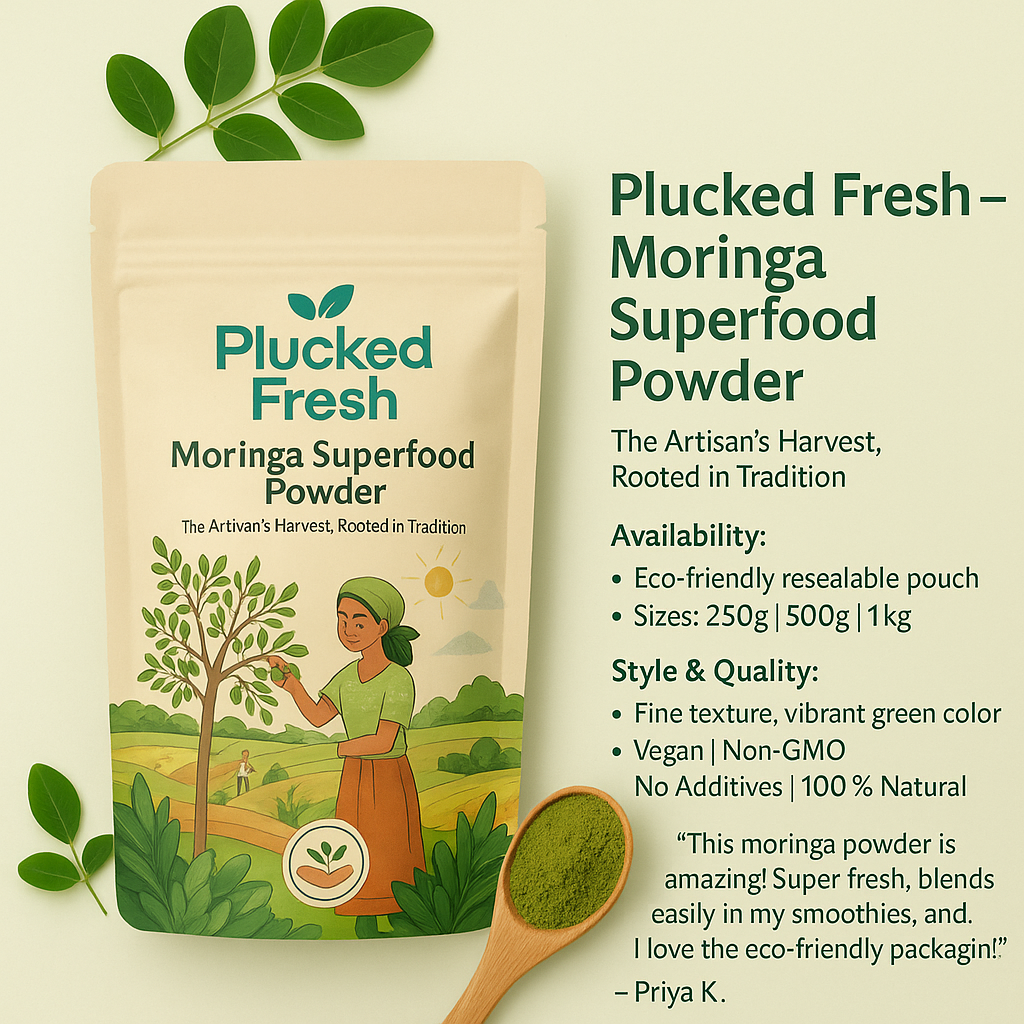 Fuel your body with the power of 100% pure moringa leaf powder. Hand-harvested, shade-dried, and finely ground, our powder delivers a rich source of vitamins, minerals, and antioxidants to support energy, immunity, and overall wellness.