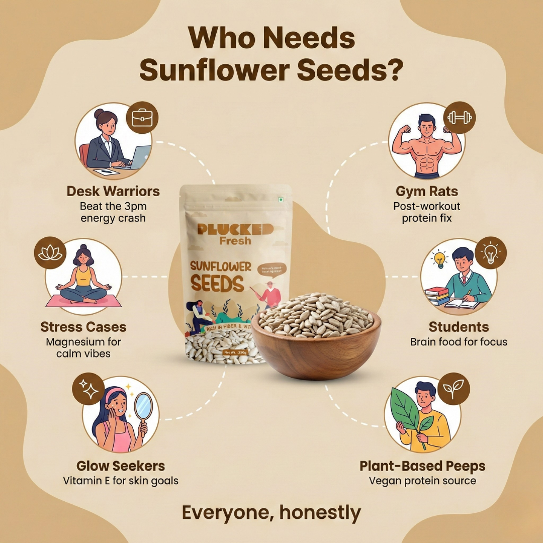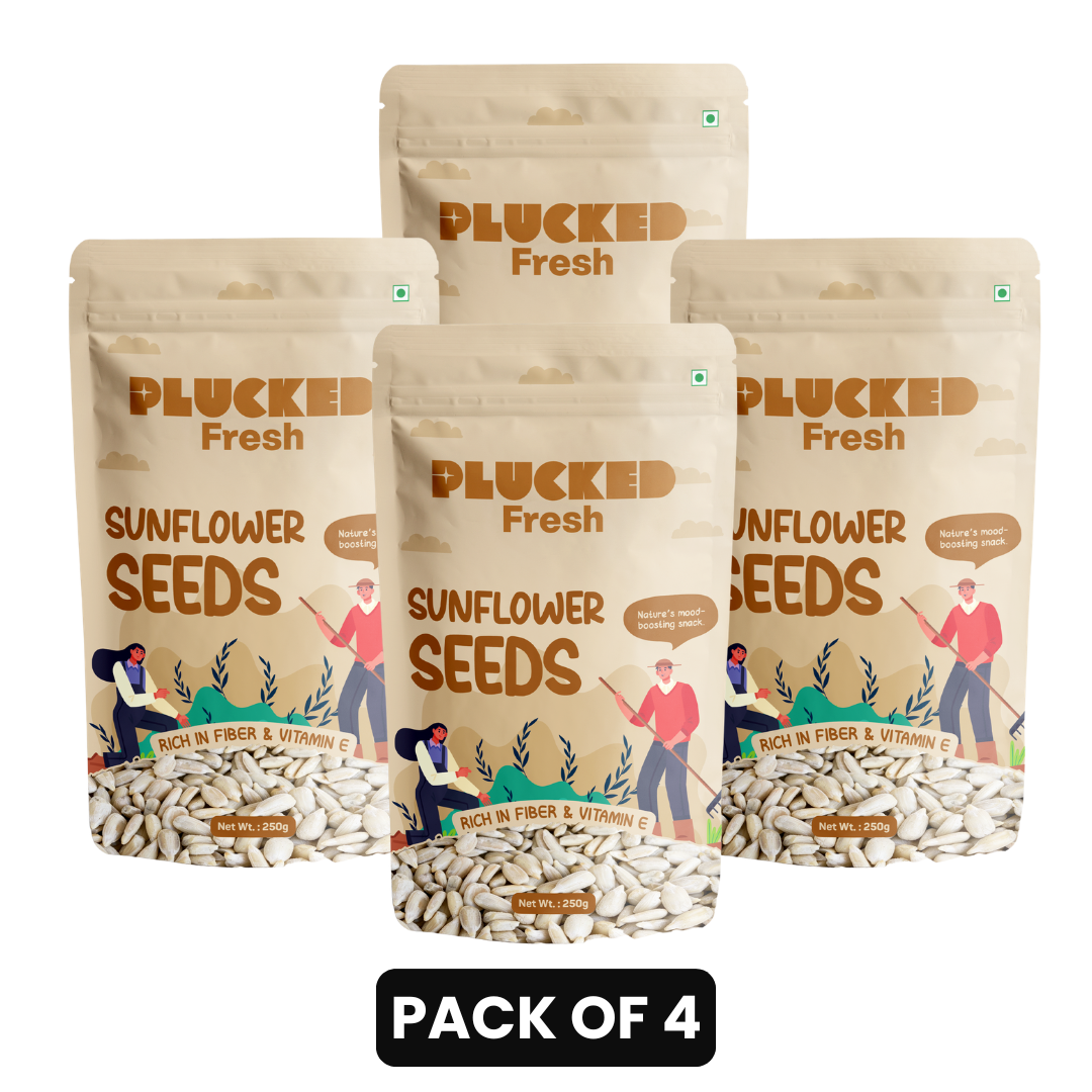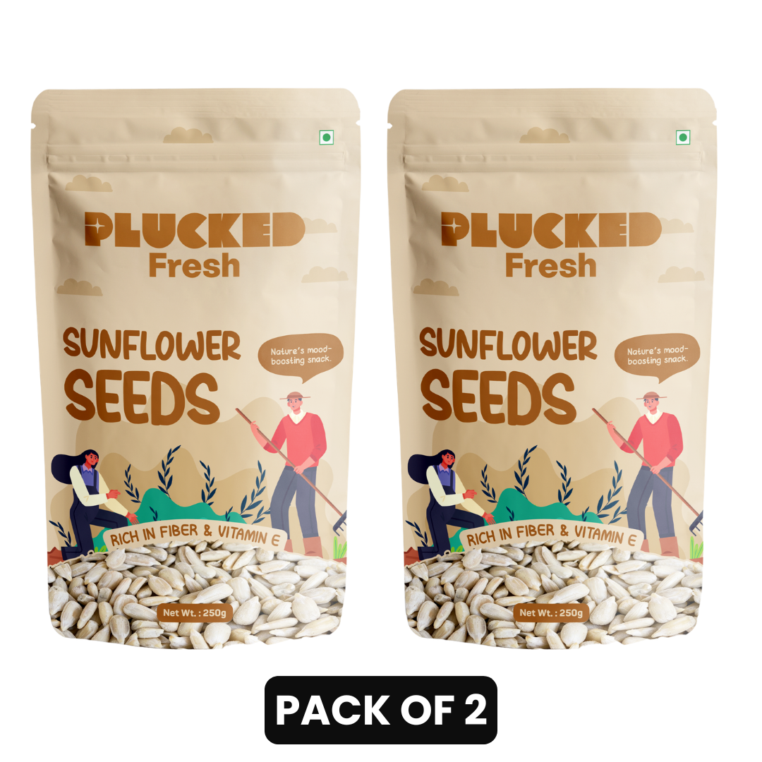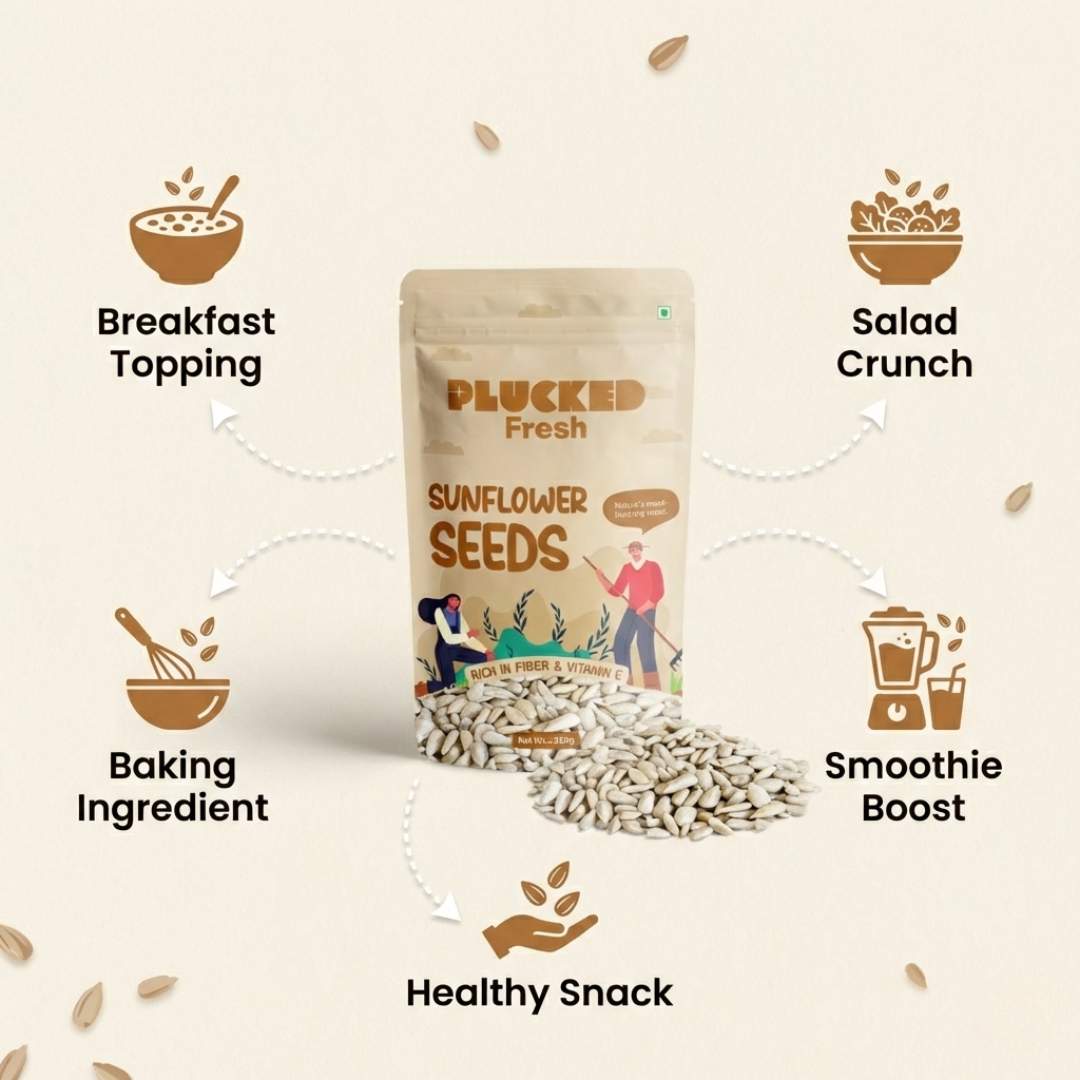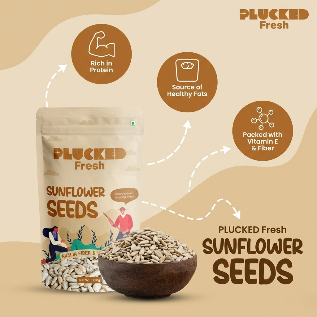 Plucked Fresh Sunflower Seeds are premium quality, nutrient-rich seeds packed with protein, healthy fats, vitamin E, and essential minerals that support a healthy and balanced lifestyle. Carefully sourced from trusted farms and hygienically packed, our sunflower seeds deliver freshness, crunch, and natural goodness in every pack.