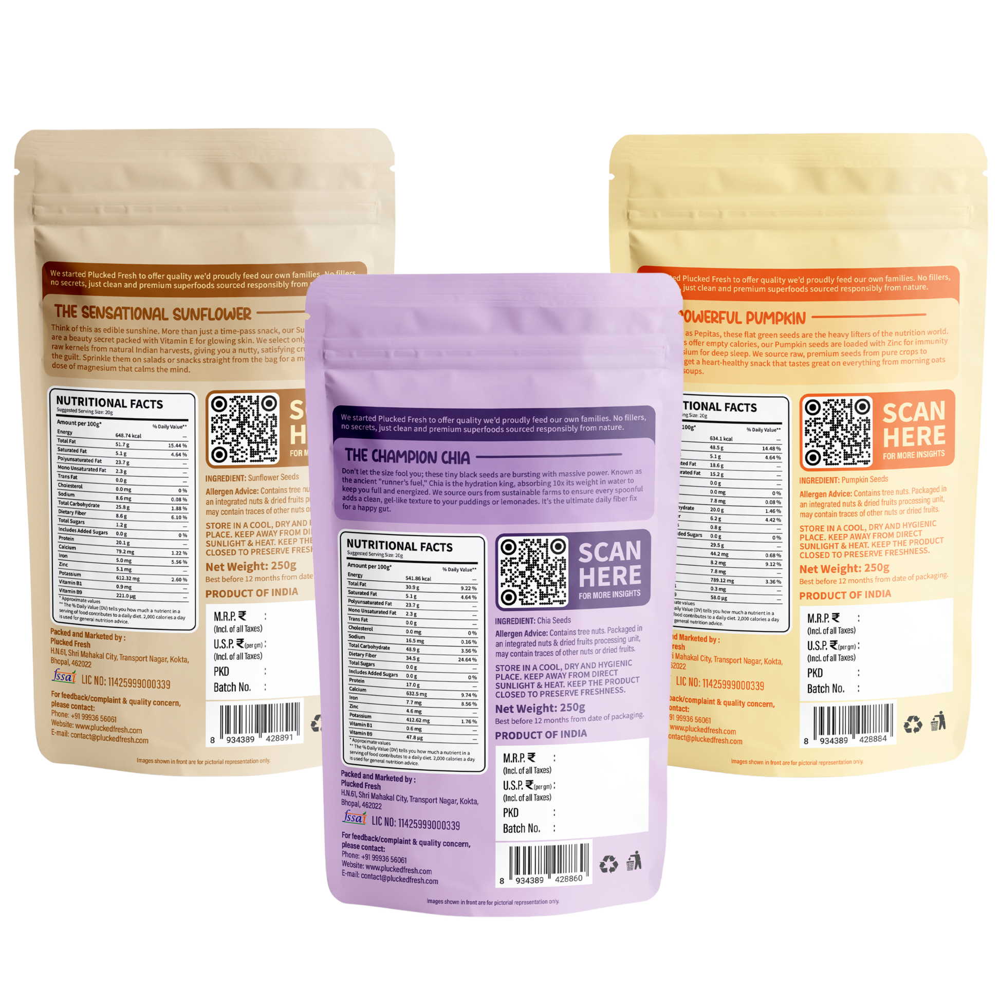 Upgrade your daily nutrition with the Plucked Fresh Super Seed Trio, a powerful combination of Sunflower Seeds, Chia Seeds, and Pumpkin Seeds packed with protein, healthy fats, omega-3 fatty acids, fiber, vitamins, and essential minerals. This carefully curated trio brings together three nutrient-dense superfood seeds to support a healthy and balanced lifestyle.